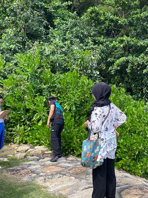 On a breezy Wednesday last week, we took a ferry down to Pulau Sekijang Pelepah (Lazarus Island) with HYSS to learn about the Indigenous flora and fauna of our Southern Islands, guided by Mak Noni and Mak Ani, who were born and raised on the island. We discussed the historical significance of the island to the Orang Laut, and its uses over the years as it changed hands under the colonial government, Singapore authorities, and the Sentosa Development Corporation. The ecotourism gem that it is marketed as today appears rather detached from the stories of the Orang Pulau who once called the island home, but it is also one of the few remaining Southern Islands that are still publicly accessible. We were so thankful to have Nak Ani and Mak Noni with us to bring these stories to life – especially as they shared their traditional knowledge of animals and plants found on the island, such as the pokok pelampung, used by islanders to relieve congestion (buang angin) after childbirth.